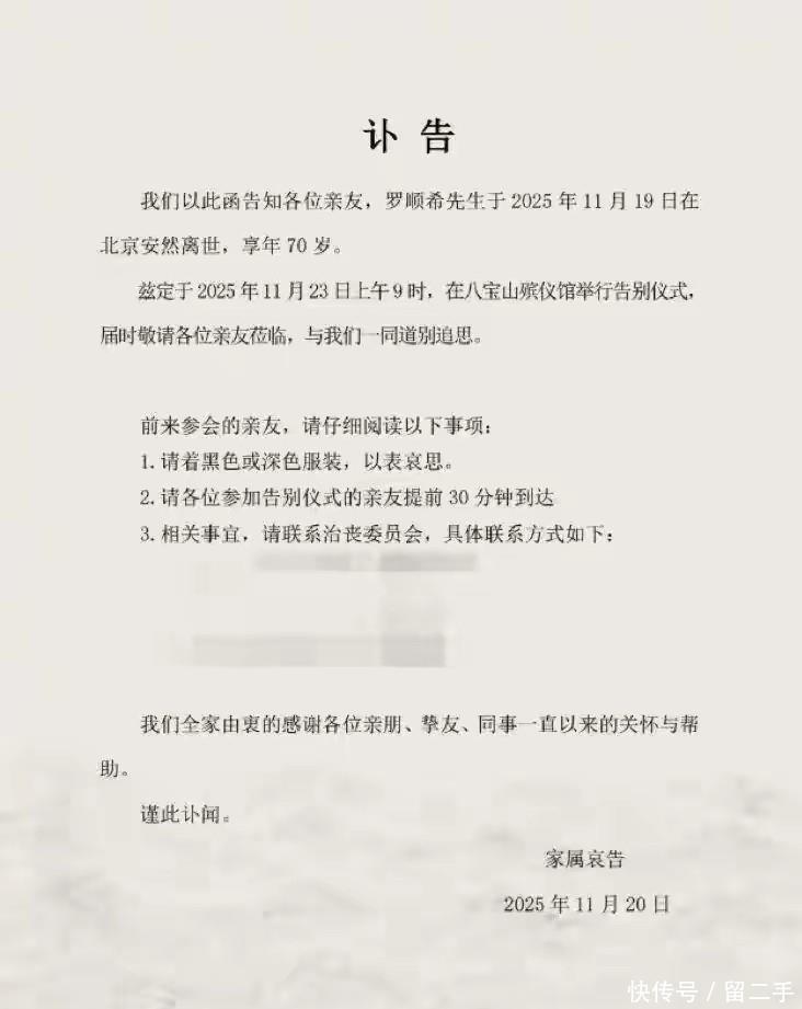 现场媒体还拍到唐嫣父亲低调到场致哀,艺人明道也专程前来悼念。 此前11月20日,罗晋经纪人已通过朋友圈发布讣告,告知罗父于11月19日在北京安然离世,享年70岁。
